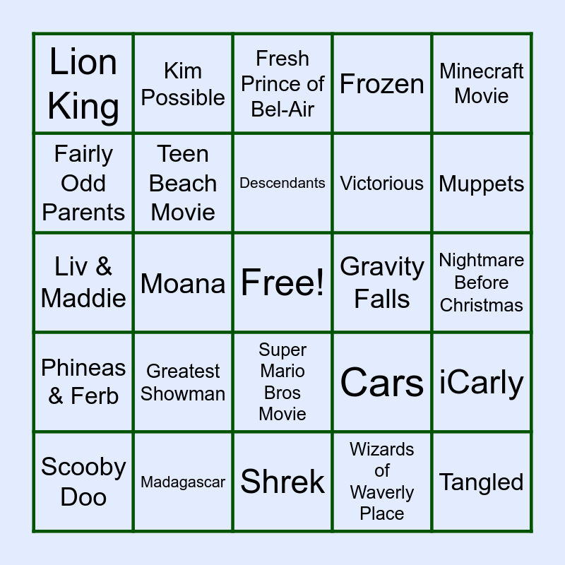 This bingo card has a free space and 28 words: iCarly, Big Time Rush, Victorious, Wizards of Waverly Place, Fairly Odd Parents, Fresh Prince of Bel-Air, Kim Possible, Phineas & Ferb, Gravity Falls, Scooby Doo, Liv & Maddie, Frozen, Madagascar, Shrek, Muppets, The Lorax, Greatest Showman, Teen Beach Movie, Descendants, Super Mario Bros Movie, Lion King, Encanto, Tangled, Moana, Nightmare Before Christmas, Cars, Minecraft Movie and Lego Movie.