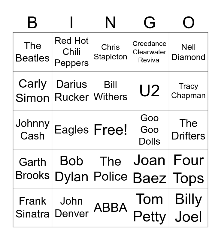This bingo card has a free space and 29 words: Frank Sinatra, Bob Seger, Eagles, Elvis, The Beatles, Chris Stapleton, Darius Rucker, Bob Dylan, Goo Goo Dolls, John Denver, The Drifters, Billy Joel, ABBA, Tom Petty, Tracy Chapman, Marvin Gaye, The Police, Garth Brooks, Neil Diamond, Johnny Cash, Joan Baez, The Foundations, U2, Carly Simon, Creedance Clearwater Revival, Red Hot Chili Peppers, Four Tops, Bill Withers and Ben E. King.