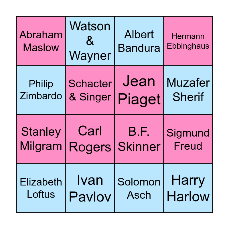 This bingo card has 16 words: Ivan Pavlov, Sigmund Freud, Albert Bandura, Abraham Maslow, Stanley Milgram, Watson & Wayner, B.F. Skinner, Solomon Asch, Philip Zimbardo, Schacter & Singer, Elizabeth Loftus, Hermann Ebbinghaus, Carl Rogers, Muzafer Sherif, Jean Piaget and Harry Harlow.