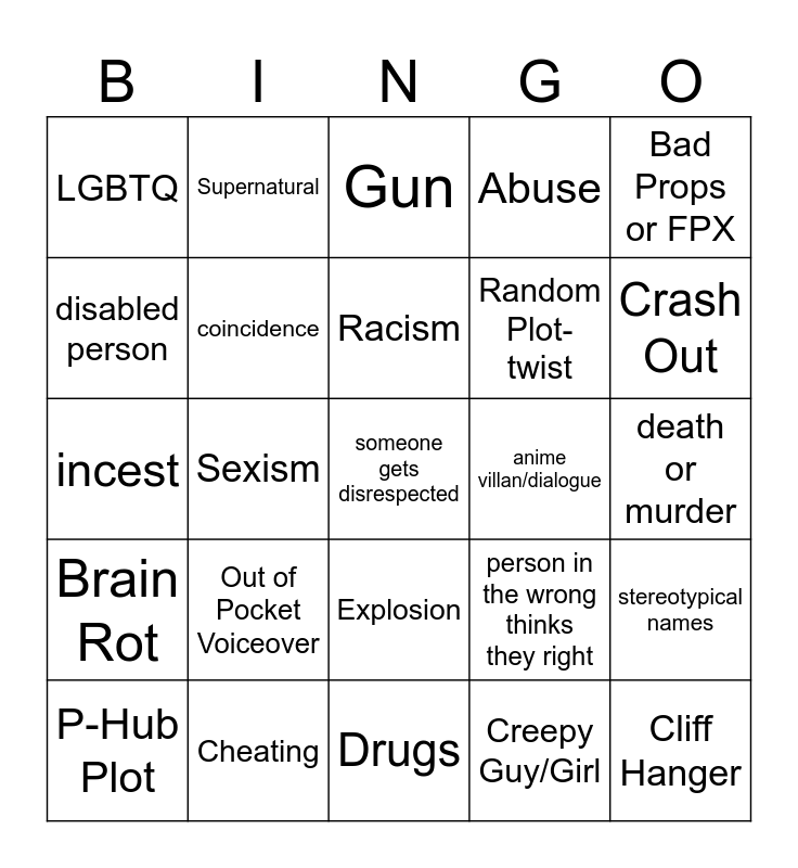 This bingo card has a free space and 24 words: P-Hub Plot, Out of Pocket Voiceover, Racism, Creepy Guy/Girl, Bad Props or FPX, LGBTQ, Supernatural, Gun, anime villan/dialogue, death or murder, incest, coincidence, person in the wrong thinks they right, stereotypical names, disabled person, Cheating, Drugs, Abuse, Crash Out, Brain Rot, Sexism, Explosion, Random Plot-twist and Cliff Hanger.