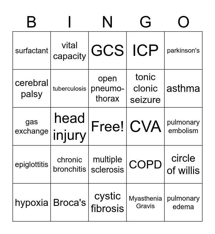 This bingo card has a free space and 24 words: chronic bronchitis, Broca's, open pneumo- thorax, hypoxia, parkinson's, surfactant, cerebral palsy, vital capacity, CVA, multiple sclerosis, tonic clonic seizure, gas exchange, COPD, circle of willis, tuberculosis, Myasthenia Gravis, pulmonary embolism, GCS, asthma, head injury, pulmonary edema, epiglottitis, ICP and cystic fibrosis.