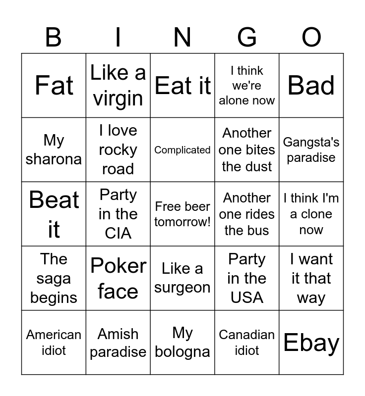 This bingo card has a free space and 30 words: Amish paradise, White & nerdy, Party in the CIA, Polka face, Fat, Eat it, I love rocky road, Like a surgeon, Another one rides the bus, My bologna, I think I'm a clone now, Ebay, Canadian idiot, A complicated song, Gangsta's paradise, Ridin', Party in the USA, The saga begins, Poker face, Bad, Beat it, I love rock 'n roll, Like a virgin, Another one bites the dust, My sharona, I think we're alone now, I want it that way, American idiot, Complicated and American pie.