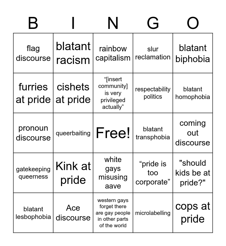 This bingo card has a free space and 24 words: Kink at pride, Ace discourse, “[insert community] is very privileged actually”, blatant lesbophobia, blatant biphobia, flag discourse, furries at pride, blatant racism, blatant transphobia, white gays misusing aave, respectability politics, pronoun discourse, “pride is too corporate”, "should kids be at pride?", cishets at pride, microlabelling, coming out discourse, rainbow capitalism, blatant homophobia, queerbaiting, cops at pride, gatekeeping queerness, slur reclamation and western gays forget there are gay people in other parts of the world.