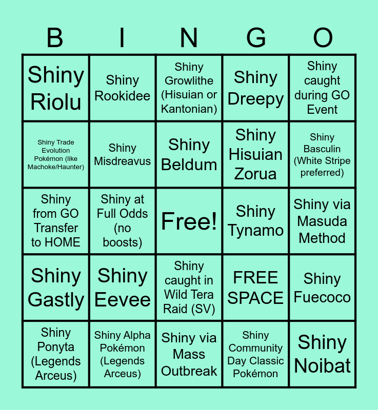 This bingo card has a free space and 25 words: Shiny Eevee, Shiny via Mass Outbreak, Shiny Beldum, Shiny Ponyta (Legends Arceus), Shiny caught during GO Event, Shiny Riolu, Shiny Trade Evolution Pokémon (like Machoke/Haunter), Shiny Rookidee, Shiny Tynamo, Shiny caught in Wild Tera Raid (SV), Shiny Hisuian Zorua, Shiny from GO Transfer to HOME, FREE SPACE, Shiny Fuecoco, Shiny Misdreavus, Shiny Rufflet, Shiny via Masuda Method, Shiny Growlithe (Hisuian or Kantonian), Shiny Basculin (White Stripe preferred), Shiny at Full Odds (no boosts), Shiny Noibat, Shiny Alpha Pokémon (Legends Arceus), Shiny Gastly, Shiny Dreepy and Shiny Community Day Classic Pokémon.