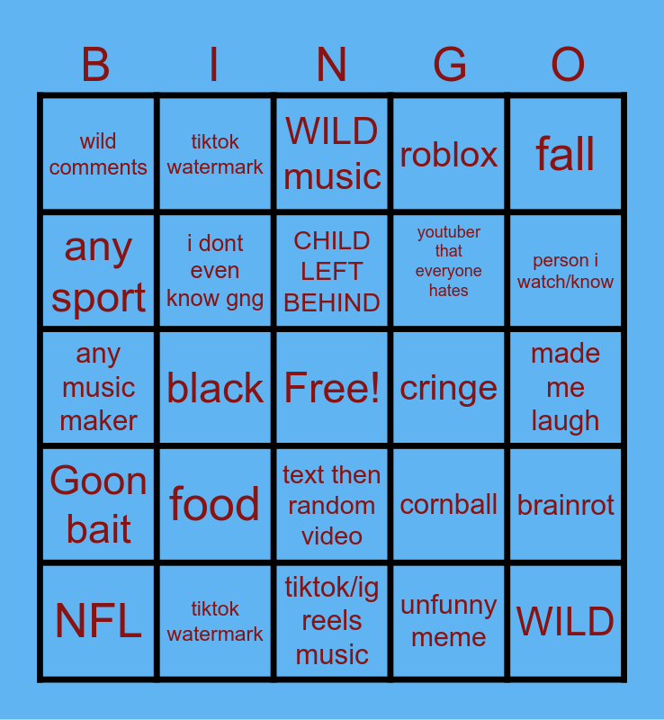 This bingo card has a free space and 24 words: food, tiktok watermark, CHILD LEFT BEHIND, NFL, fall, wild comments, any sport, tiktok watermark, cringe, text then random video, youtuber that everyone hates, any music maker, cornball, brainrot, i dont even know gng, unfunny meme, made me laugh, WILD music, person i watch/know, black, WILD, Goon bait, roblox and tiktok/ig reels music.