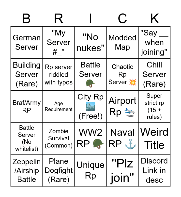 This bingo card has a free space and 24 words: Zombie Survival (Common), Plane Dogfight (Rare), Battle Server 🪖, Zeppelin /Airship Battle, ''Say __ when joining'', German Server, Building Server (Rare), ''My Server #_'', Airport Rp 🛬, WW2 RP 🪖, Chaotic Rp Server 💥, Braf/Army RP, Naval RP ⚓, Weird Title, Rp server riddled with typos, ''Plz join'', Super strict rp (15 + rules), ''No nukes'', Chill Server (Rare), Age Requirement, Discord Link in desc, Battle Server (No whitelist), Modded Map and Unique Rp.