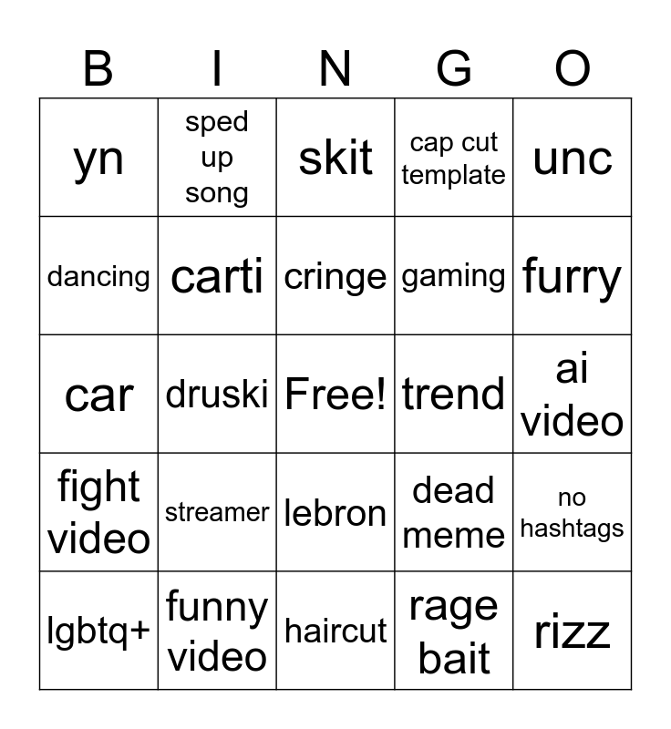 This bingo card has a free space and 24 words: streamer, funny video, cringe, lgbtq+, unc, yn, dancing, sped up song, trend, lebron, gaming, car, dead meme, no hashtags, carti, rage bait, ai video, skit, furry, druski, rizz, fight video, cap cut template and haircut.