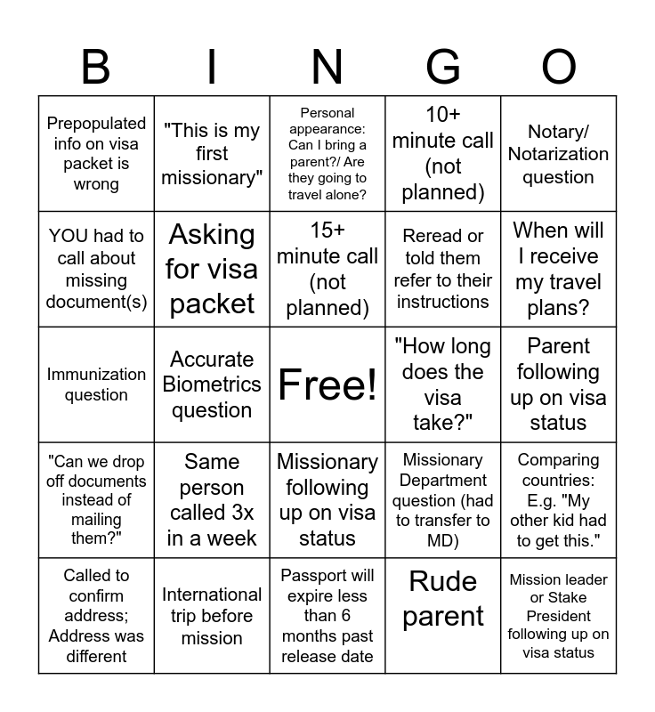 This bingo card has a free space and 31 words: Passport will expire less than 6 months past release date, International trip before mission, Accurate Biometrics question, Apostille question, Prepopulated info on visa packet is wrong, Personal appearance: Can I bring a parent?/ Are they going to travel alone?, Asking for visa packet, Missionary Department question (had to transfer to MD), "How long does the visa take?", Rude parent, Parent following up on visa status, Mission leader or Stake President following up on visa status, Called back to confirm address, "Do I really need to turn in my passport?", When will I receive my travel plans?, Checking if received documents, Comparing countries: E.g. "My other kid had to get this.", Same person called 3x in a week, "Can we drop off documents instead of mailing them?", Missionary following up on visa status, Notary/ Notarization question, Name on passport is different in TC/GVM, Called to confirm address; Address was different, "This is my first missionary", Reread or told them refer to their instructions, YOU had to call about missing document(s), 10+ minute call (not planned), Immunization question, International trip before mission, 15+ minute call (not planned) and 20+ minute call (not planned).