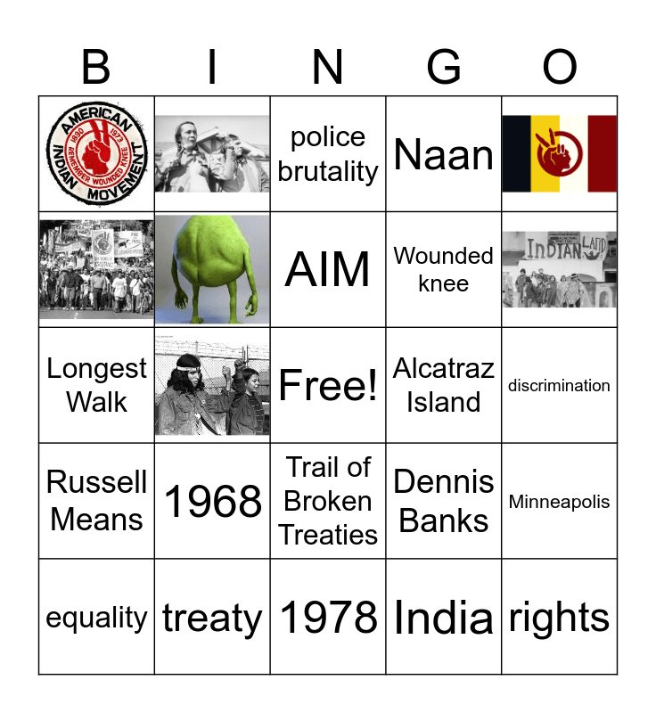 This bingo card has 7 images, a free space and 18 words: 1968, 1978, AIM, equality, Alcatraz Island, Trail of Broken Treaties, Wounded knee, Longest Walk, Dennis Banks, Minneapolis, poverty, discrimination, police brutality, rights, treaty, Russell Means, Naan and India.
