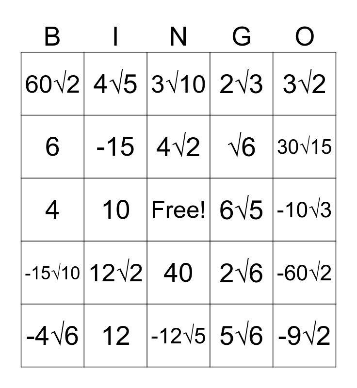 This bingo card has a free space and 31 words: -12√5, -6, 10, √10, 60√2, 3√10, -15, 2√6, 6√5, 5√6, -10√3, -9√2, -10, -2√6, 30√15, -6√6, -60√2, 12√2, -15√10, 40, 3√2, 8√6, -4√6, 4√5, √6, 6, 2√3, 4, 12, 4√2 and 5√2.