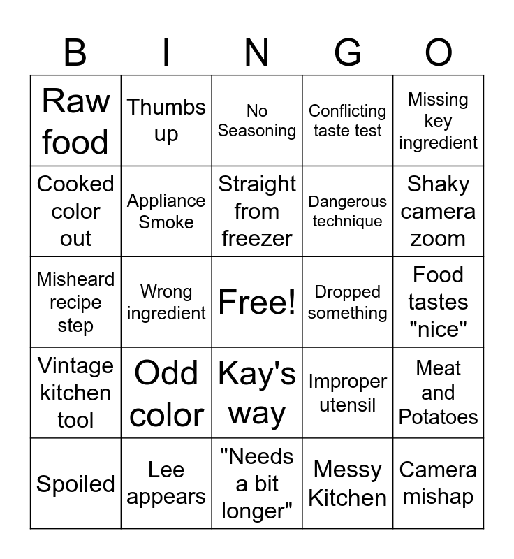 This bingo card has a free space and 30 words: Lee appears, Background noise, Wrong ingredient, Burnt food, Raw food, No Seasoning, Appliance Smoke, Kay's way, Dropped something, "Needs a bit longer", Food tastes "nice", Camera mishap, Messy Kitchen, Mystery meat, Shaky camera zoom, Honion or Carriot, Improper utensil, Vintage kitchen tool, Odd color, Missing key ingredient, Misheard recipe step, Loud clatter, Thumbs up, Dangerous technique, Cooked color out, Conflicting taste test, Meat and Potatoes, Spoiled, Straight from freezer and Weird plating.