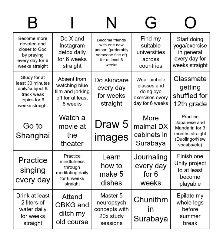 This bingo card has a free space and 24 words: Practice mindfulness through meditating daily for 6 weeks straight, Attend OBKG and ditch my old course, Do skincare every day for weeks straight, Drink at least 2 liters of water daily for weeks straight, Start doing yoga/exercise in general every day for weeks straight, Become more devoted and closer to God by praying every day for 6 weeks straight, Study for at least 30 minutes daily/subject & track weak topics for 6 weeks straight, Do X and Instagram detox daily for 6 weeks straight, More maimai DX cabinets in Surabaya, Learn how to make 5 dishes, Wear pinhole glasses and doing eye exercises every day for 6 weeks, Go to Shanghai, Journaling every day for 6 weeks, Finish one Unity project to at least become playable, Absent from watching blue film and jorking off for at least 6 weeks, Chunithm in Surabaya, Practice Japanese and Mandarin for 3 months straight (Duolingo/New vocabs/etc), Become friends with one new person (preferably someone fine af) for at least 6 weeks, Classmate getting shuffled for 12th grade, Watch a movie at the theater, Epilate my whole legs before summer break, Practice singing every day, Find my suitable universities across countries and Master 5 neuropsych concepts with 20x study sessions.