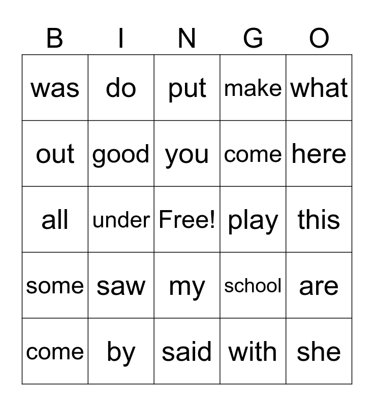 This bingo card has a free space and 24 words: saw, by, you, come, what, was, out, do, play, my, come, all, school, are, good, with, this, put, here, under, she, some, make and said.