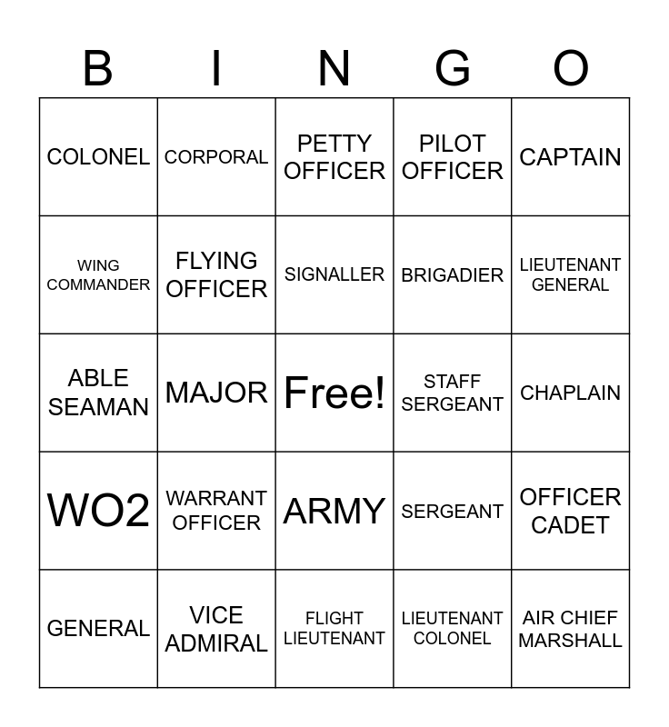 This bingo card has a free space and 48 words: AIR FORCE, AIR CHIEF MARSHALL, GROUP CAPTAIN, FLIGHT LIEUTENANT, WARRANT OFFICER, FLIGHT SERGEANT, CORPORAL, AIR COMMODORE, WING COMMANDER, SQUADRON LEADER, FLYING OFFICER, PILOT OFFICER, OFFICER CADET, SERGEANT, LEADING AIRCRAFT WOMAN, PRIVATE, SIGNALLER, STAFF SERGEANT, LIEUTENANT, CAPTAIN, MAJOR, LIEUTENANT COLONEL, COLONEL, BRIGADIER, MAJOR GENERAL, LIEUTENANT GENERAL, GENERAL, LANCE CORPORAL, ARMY, WO2, WO1, SERGEANT MAJOR, NAVY, ADMIRAL, VICE ADMIRAL, REAR ADMIRAL, COMMANDER, CHAPLAIN, LIEUTENANT COMMANDER, SUB LIEUTENANT, MIDSHIPMAN, CHIEF PETTY OFFICER, PETTY OFFICER, LEADING SEAMAN, ABLE SEAMAN, SEAMAN, TROOPER and SAPPER.