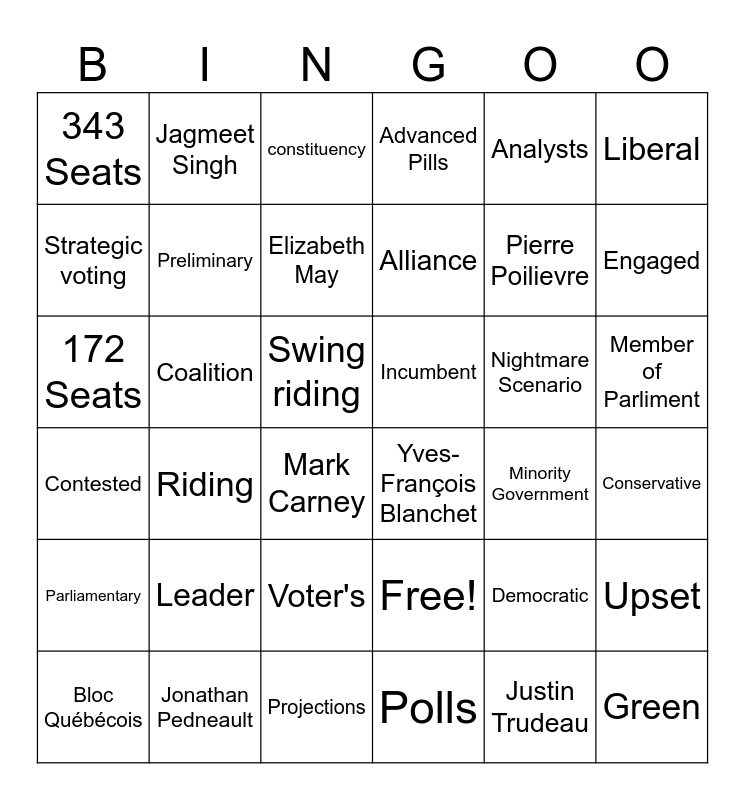 This bingo card has 36 words: Free!, Voter's, Polls, Strategic voting, Contested, Incumbent, Preliminary, Projections, Analysts, Democratic, Engaged, Advanced Pills, Upset, Coalition, Alliance, 343 Seats, Parliamentary, Nightmare Scenario, 172 Seats, constituency, Swing riding, Riding, Yves-François Blanchet, Mark Carney, Minority Government, Jagmeet Singh, Pierre Poilievre, Jonathan Pedneault, Elizabeth May, Liberal, Green, Bloc Québécois, Conservative, Member of Parliment, Leader and Justin Trudeau.