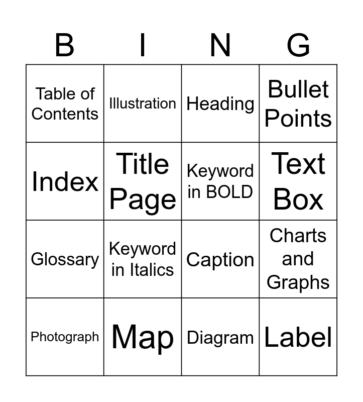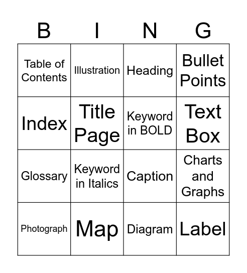 This bingo card has 16 words: Map, Charts and Graphs, Heading, Table of Contents, Glossary, Illustration, Caption, Diagram, Index, Title Page, Photograph, Bullet Points, Keyword in Italics, Text Box, Keyword in BOLD and Label.