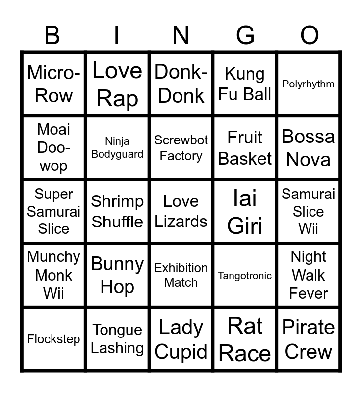 This bingo card has a free space and 24 words: Bunny Hop, Tongue Lashing, Screwbot Factory, Flockstep, Polyrhythm, Micro-Row, Moai Doo-wop, Love Rap, Iai Giri, Exhibition Match, Fruit Basket, Super Samurai Slice, Tangotronic, Night Walk Fever, Ninja Bodyguard, Rat Race, Samurai Slice Wii, Donk-Donk, Bossa Nova, Shrimp Shuffle, Pirate Crew, Munchy Monk Wii, Kung Fu Ball and Lady Cupid.