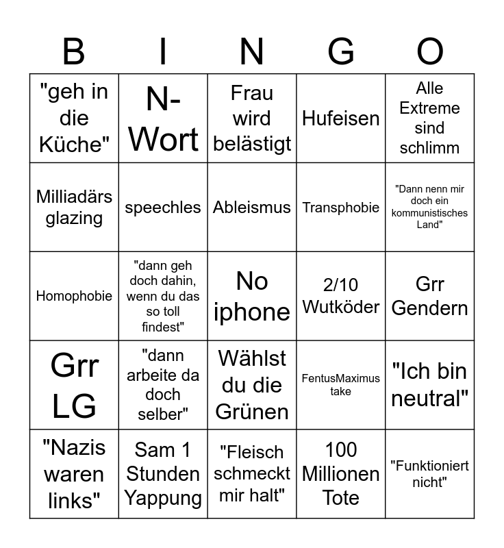 This bingo card has a free space and 24 words: "dann arbeite da doch selber", Sam 1 Stunden Yappung, Ableismus, "Nazis waren links", Alle Extreme sind schlimm, "geh in die Küche", Milliadärs glazing, N-Wort, 2/10 Wutköder, Wählst du die Grünen, Transphobie, Homophobie, FentusMaximus take, "Ich bin neutral", speechles, 100 Millionen Tote, Grr Gendern, Frau wird belästigt, "Dann nenn mir doch ein kommunistisches Land", "dann geh doch dahin, wenn du das so toll findest", "Funktioniert nicht", Grr LG, Hufeisen and "Fleisch schmeckt mir halt".