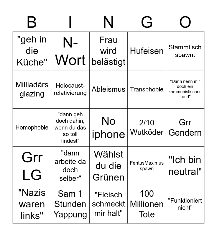 This bingo card has a free space and 24 words: "dann arbeite da doch selber", Sam 1 Stunden Yappung, Ableismus, "Nazis waren links", Stammtisch spawnt, "geh in die Küche", Milliadärs glazing, N-Wort, 2/10 Wutköder, Wählst du die Grünen, Transphobie, Homophobie, FentusMaximus spawn, "Ich bin neutral", Holocaust- relativierung, 100 Millionen Tote, Grr Gendern, Frau wird belästigt, "Dann nenn mir doch ein kommunistisches Land", "dann geh doch dahin, wenn du das so toll findest", "Funktioniert nicht", Grr LG, Hufeisen and "Fleisch schmeckt mir halt".