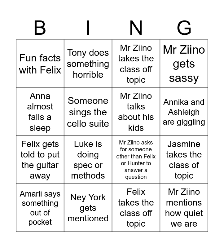 This bingo card has 16 words: Ney York gets mentioned, Jasmine takes the class of topic, Mr Ziino takes the class off topic, Fun facts with Felix, Felix gets told to put the guitar away, Tony does something horrible, Mr Ziino asks for someone other than Felix or Hunter to answer a question, Felix takes the class off topic, Anna almost falls a sleep, Someone sings the cello suite, Amarli says something out of pocket, Mr Ziino gets sassy, Luke is doing spec or methods, Annika and Ashleigh are giggling, Mr Ziino talks about his kids and Mr Ziino mentions how quiet we are.