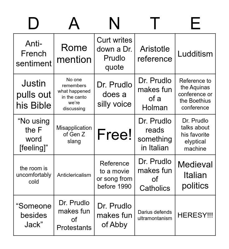 This bingo card has a free space and 24 words: Anticlericalism, Dr. Prudlo makes fun of Protestants, Dr. Prudlo does a silly voice, “Someone besides Jack”, Ludditism, Anti-French sentiment, Justin pulls out his Bible, Rome mention, Dr. Prudlo reads something in Italian, Reference to a movie or song from before 1990, Dr. Prudlo makes fun of a Holman, “No using the F word [feeling]”, Dr. Prudlo makes fun of Catholics, Medieval Italian politics, No one remembers what happened in the canto we’re discussing, Darius defends ultramontanism, Dr. Prudlo talks about his favorite elyptical machine, Curt writes down a Dr. Prudlo quote, Reference to the Aquinas conference or the Boethius conference, Misapplication of Gen Z slang, HERESY!!!, the room is uncomfortably cold, Aristotle reference and Dr. Prudlo makes fun of Abby.