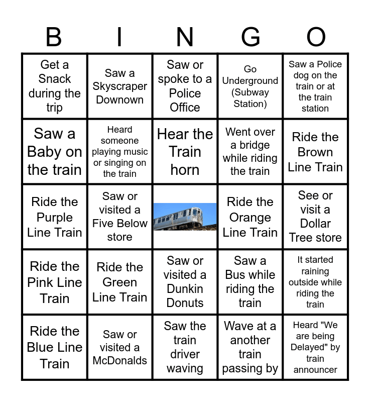 This bingo card has a free space and 24 words: Ride the Green Line Train, Saw or visited a McDonalds, Hear the Train horn, Ride the Blue Line Train, Saw a Police dog on the train or at the train station, Get a Snack during the trip, Saw a Baby on the train, Saw a Skyscraper Downown, Ride the Orange Line Train, Saw or visited a Dunkin Donuts, Went over a bridge while riding the train, Ride the Purple Line Train, Saw a Bus while riding the train, It started raining outside while riding the train, Heard someone playing music or singing on the train, Wave at a another train passing by, See or visit a Dollar Tree store, Saw or spoke to a Police Office, Ride the Brown Line Train, Saw or visited a Five Below store, Heard "We are being Delayed" by train announcer, Ride the Pink Line Train, Go Underground (Subway Station) and Saw the train driver waving.
