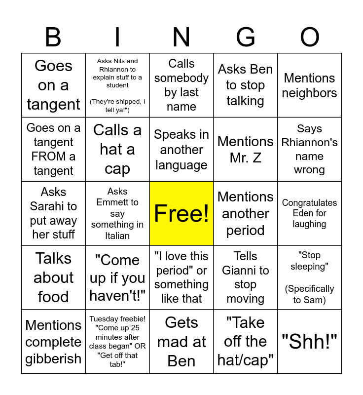 This bingo card has a free space and 24 words: "Come up if you haven't!", Tuesday freebie! "Come up 25 minutes after class began" OR "Get off that tab!", Speaks in another language, Mentions complete gibberish, Mentions neighbors, Goes on a tangent, Goes on a tangent FROM a tangent, Asks Nils and Rhiannon to explain stuff to a student (They're shipped, I tell ya!"), Mentions another period, "I love this period" or something like that, Mentions Mr. Z, Asks Sarahi to put away her stuff, Tells Gianni to stop moving, "Stop sleeping" (Specifically to Sam), Calls a hat a cap, "Take off the hat/cap", Congratulates Eden for laughing, Calls somebody by last name, Says Rhiannon's name wrong, Asks Emmett to say something in Italian, "Shh!", Talks about food, Asks Ben to stop talking and Gets mad at Ben.