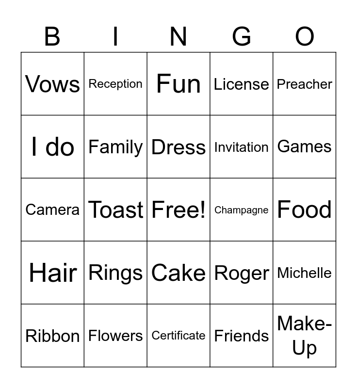 This bingo card has a free space and 24 words: Rings, Flowers, Dress, Ribbon, Preacher, Vows, I do, Reception, Champagne, Cake, Invitation, Camera, Roger, Michelle, Family, Friends, Food, Fun, Games, Toast, Make-Up, Hair, License and Certificate.