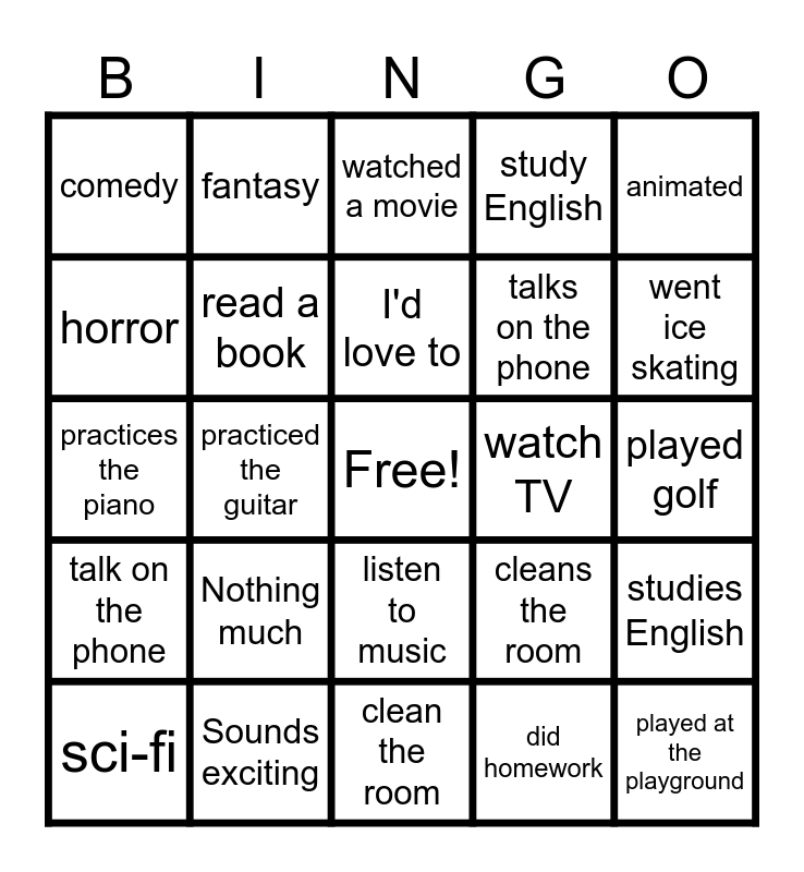 This bingo card has a free space and 24 words: Nothing much, Sounds exciting, I'd love to, sci-fi, animated, comedy, horror, fantasy, watch TV, listen to music, talks on the phone, practices the piano, cleans the room, studies English, read a book, did homework, played golf, watched a movie, went ice skating, practiced the guitar, played at the playground, talk on the phone, study English and clean the room.
