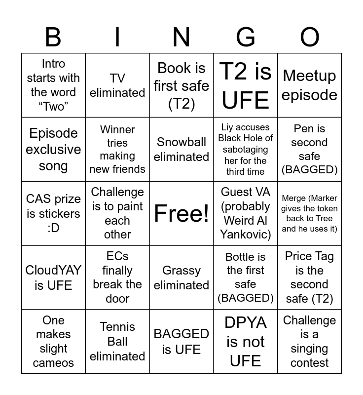 This bingo card has a free space and 24 words: ECs finally break the door, Tennis Ball eliminated, Snowball eliminated, One makes slight cameos, Meetup episode, Intro starts with the word “Two”, Episode exclusive song, TV eliminated, Guest VA (probably Weird Al Yankovic), Grassy eliminated, Liy accuses Black Hole of sabotaging her for the third time, CAS prize is stickers :D, Bottle is the first safe (BAGGED), Price Tag is the second safe (T2), Winner tries making new friends, DPYA is not UFE, Merge (Marker gives the token back to Tree and he uses it), Book is first safe (T2), Pen is second safe (BAGGED), Challenge is to paint each other, Challenge is a singing contest, CloudYAY is UFE, T2 is UFE and BAGGED is UFE.