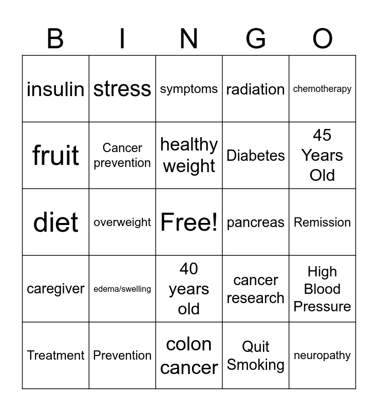 This bingo card has a free space and 44 words: medication, neuropathy, nutrition, Treatment, Gut Health, Quit Smoking, symptoms, risk factors, chemotherapy, Prevention, radiation, pancreas, 40 years old, edema/swelling, family history, colon cancer, lung cancer, diet, limit alcohol use, 45 Years Old, stress, Colonoscopy, genetic testing, insulin, sleep, Remission, Sugar, breast cancer, cancer research, caregiver, Screening, High Blood Pressure, African-Americans, Exercise, overweight, plant-based diet, reduce sodium/salt, vegetable, healthy weight, fruit, Diabetes, cholesterol, Cancer prevention and Hypertension.