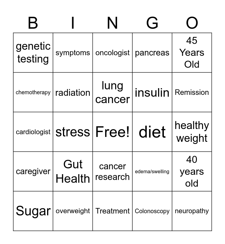 This bingo card has a free space and 49 words: medication, neuropathy, nutrition, Treatment, Gut Health, Quit Smoking, symptoms, risk factors, chemotherapy, Prevention, radiation, pancreas, 40 years old, edema/swelling, family history, colon cancer, lung cancer, diet, limit alcohol use, 45 Years Old, stress, Colonoscopy, genetic testing, insulin, sleep, Remission, Sugar, breast cancer, cancer research, caregiver, Screening, High Blood Pressure, African-Americans, Exercise, overweight, plant-based diet, reduce sodium/salt, vegetable, healthy weight, fruit, Diabetes, cholesterol, Cancer prevention, Hypertension, cardiologist, oncologist, endocrinologist, food as medicine and symptoms.