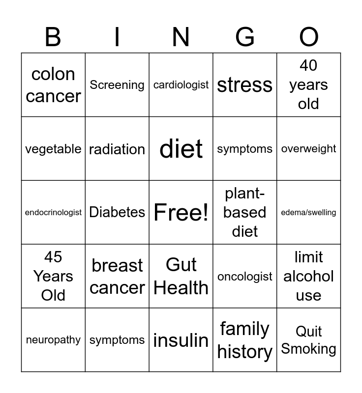 This bingo card has a free space and 49 words: risk factors, Quit Smoking, sleep, insulin, breast cancer, chemotherapy, Screening, Remission, vegetable, Cancer prevention, radiation, stress, limit alcohol use, oncologist, Sugar, Colonoscopy, diet, plant-based diet, caregiver, 40 years old, Diabetes, family history, colon cancer, symptoms, Exercise, overweight, neuropathy, Treatment, Gut Health, 45 Years Old, Hypertension, nutrition, food as medicine, genetic testing, symptoms, African-Americans, healthy weight, cholesterol, edema/swelling, fruit, lung cancer, High Blood Pressure, cancer research, medication, endocrinologist, cardiologist, pancreas, reduce sodium/salt and Prevention.