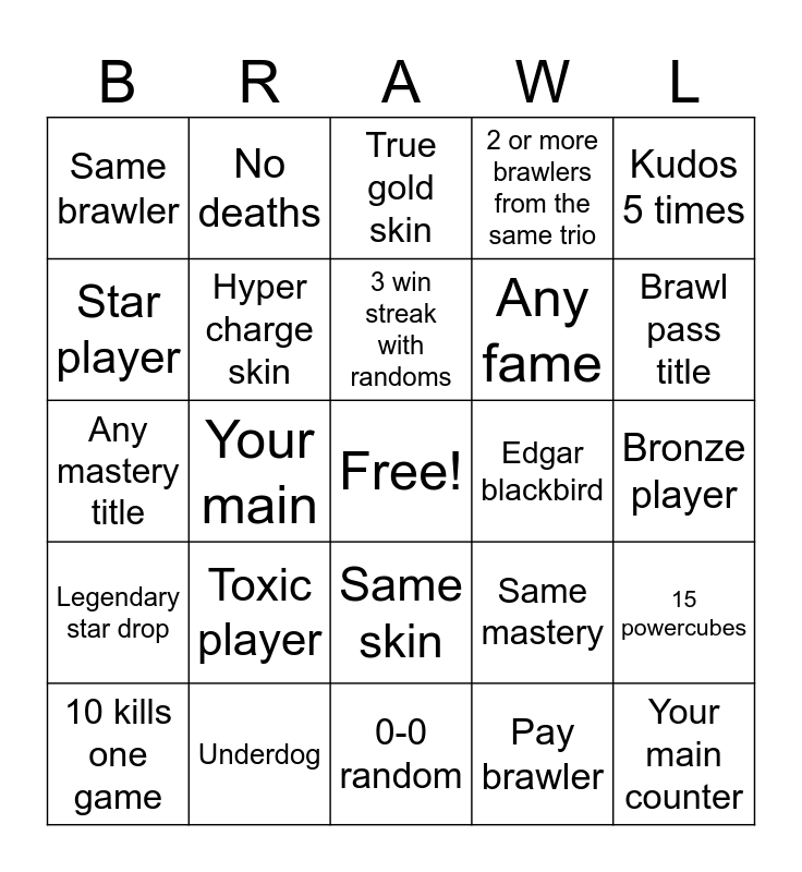 This bingo card has a free space and 24 words: Toxic player, Underdog, 3 win streak with randoms, 10 kills one game, Kudos 5 times, Same brawler, Star player, No deaths, Edgar blackbird, Same skin, Any fame, Any mastery title, Same mastery, 15 powercubes, Hyper charge skin, Pay brawler, Bronze player, True gold skin, Brawl pass title, Your main, Your main counter, Legendary star drop, 2 or more brawlers from the same trio and 0-0 random.