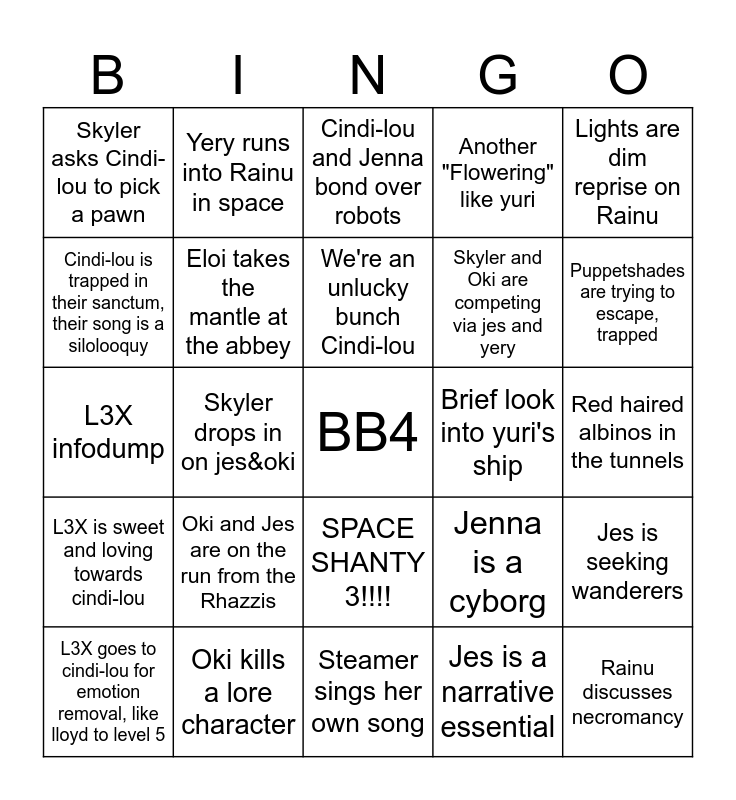 This bingo card has a free space and 24 words: L3X goes to cindi-lou for emotion removal, like lloyd to level 5, Oki and Jes are on the run from the Rhazzis, We're an unlucky bunch Cindi-lou, Jes is a narrative essential, Lights are dim reprise on Rainu, Skyler asks Cindi-lou to pick a pawn, Yery runs into Rainu in space, Cindi-lou and Jenna bond over robots, Brief look into yuri's ship, Red haired albinos in the tunnels, L3X infodump, Eloi takes the mantle at the abbey, Jenna is a cyborg, Jes is seeking wanderers, Cindi-lou is trapped in their sanctum, their song is a silolooquy, Oki kills a lore character, Steamer sings her own song, Another "Flowering" like yuri, Puppetshades are trying to escape, trapped, L3X is sweet and loving towards cindi-lou, Skyler drops in on jes&oki, SPACE SHANTY 3!!!!, Skyler and Oki are competing via jes and yery and Rainu discusses necromancy.