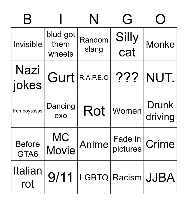 This bingo card has a free space and 24 words: MC Movie, 9/11, R.A.P.E.O, Italian rot, Monke, Invisible, Nazi jokes, blud got them wheels, Women, Anime, ???, Femboysssss, Fade in pictures, Crime, Gurt, Racism, Drunk driving, Random slang, NUT., Dancing exo, JJBA, ____ Before GTA6, Silly cat and LGBTQ.