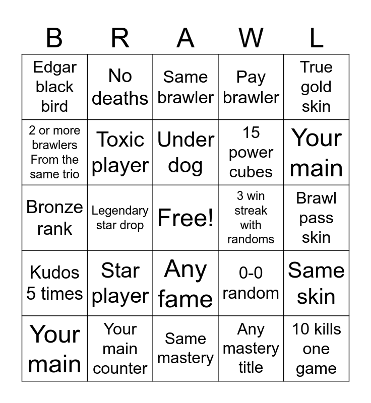 This bingo card has a free space and 24 words: Your main, Star player, Under dog, Any mastery title, True gold skin, Edgar black bird, No deaths, Same brawler, 3 win streak with randoms, Brawl pass skin, Bronze rank, Toxic player, 0-0 random, Same skin, 2 or more brawlers From the same trio, Your main counter, Same mastery, Pay brawler, Your main, Kudos 5 times, Legendary star drop, Any fame, 15 power cubes and 10 kills one game.