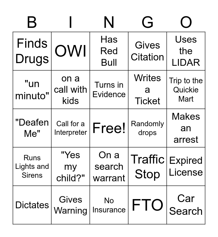 This bingo card has a free space and 24 words: "Yes my child?", Gives Warning, Turns in Evidence, Dictates, Uses the LIDAR, Finds Drugs, "un minuto", OWI, Randomly drops, On a search warrant, Writes a Ticket, "Deafen Me", Traffic Stop, Expired License, on a call with kids, FTO, Makes an arrest, Has Red Bull, Trip to the Quickie Mart, Call for a Interpreter, Car Search, Runs Lights and Sirens, Gives Citation and No Insurance.