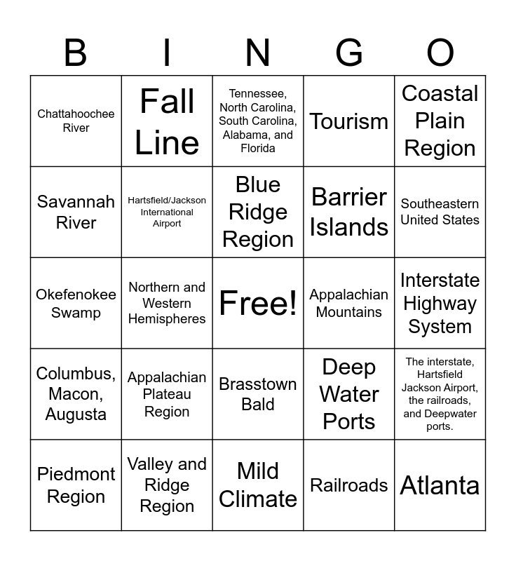 This bingo card has a free space and 24 words: Appalachian Plateau Region, Valley and Ridge Region, Blue Ridge Region, Piedmont Region, Coastal Plain Region, Chattahoochee River, Savannah River, Fall Line, Appalachian Mountains, Brasstown Bald, Barrier Islands, Okefenokee Swamp, Deep Water Ports, The interstate, Hartsfield Jackson Airport, the railroads, and Deepwater ports., Hartsfield/Jackson International Airport, Railroads, Interstate Highway System, Tennessee, North Carolina, South Carolina, Alabama, and Florida, Southeastern United States, Northern and Western Hemispheres, Atlanta, Columbus, Macon, Augusta, Tourism and Mild Climate.