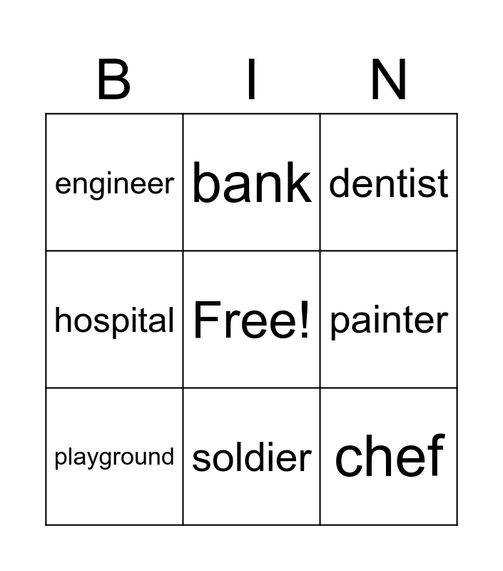 This bingo card has a free space and 15 words: nurse, doctor, dentist, engineer, soldier, chef, baker, artist, painter, pilot, library, hospital, playground, bank and restaurant.