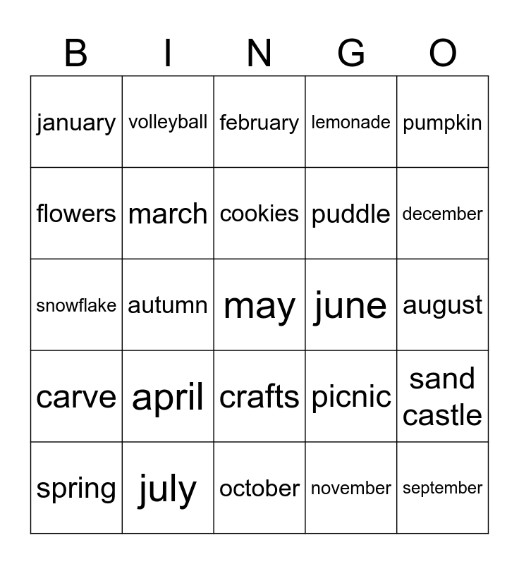 This bingo card has a free space and 29 words: spring, summer, autumn, winter, january, february, march, april, june, july, august, september, october, november, december, snowman, crafts, carve, pumpkin, snowflake, picnic, leaves, puddle, flowers, lemonade, volleyball, sand castle, cookies and christmas.