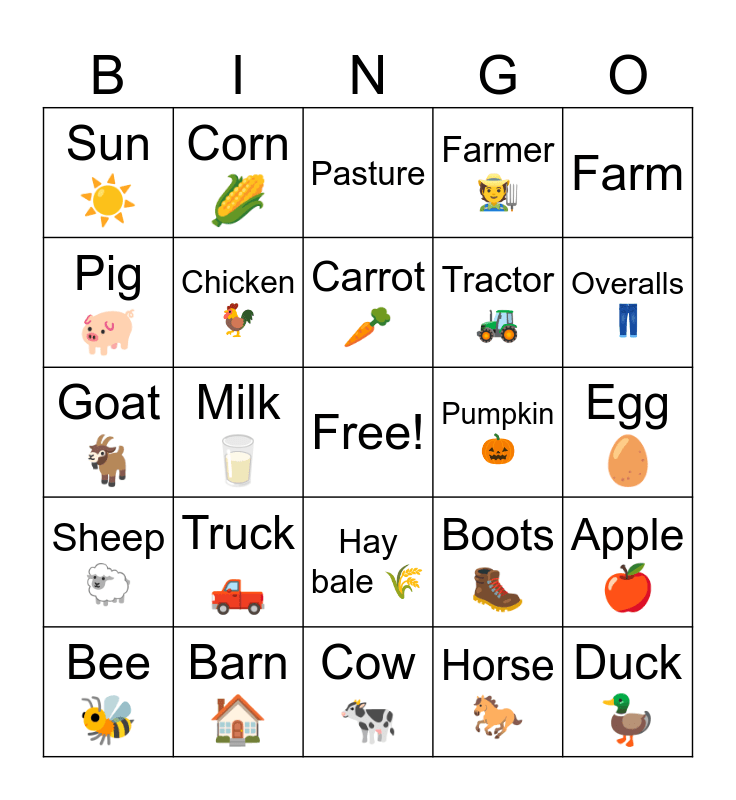 This bingo card has a free space and 24 words: Truck 🛻, Barn 🏠, Carrot 🥕, Bee 🐝, Farm, Sun ☀️, Pig 🐖, Corn 🌽, Pumpkin 🎃, Hay bale 🌾, Tractor 🚜, Goat 🐐, Boots 🥾, Apple 🍎, Chicken 🐓, Horse 🐎, Egg 🥚, Pasture, Overalls 👖, Milk 🥛, Duck 🦆, Sheep 🐑, Farmer 🧑🌾 and Cow 🐄.