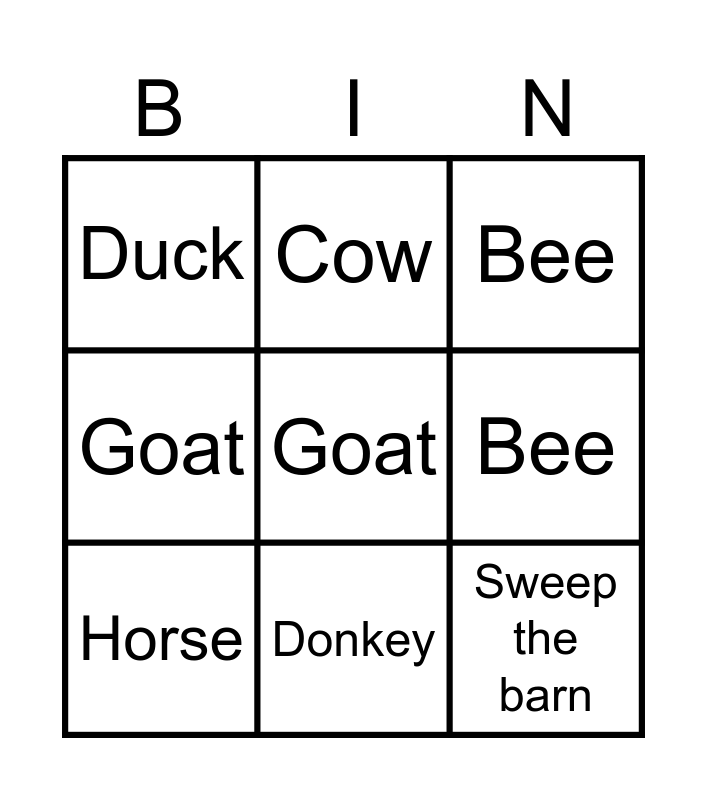 ⚠ This card has duplicate items: Chicken (2), Cow (2), Pig (2), Collect the eggs (2), Sweep the barn (2), Duck (2), Donkey (2), Bee (2)