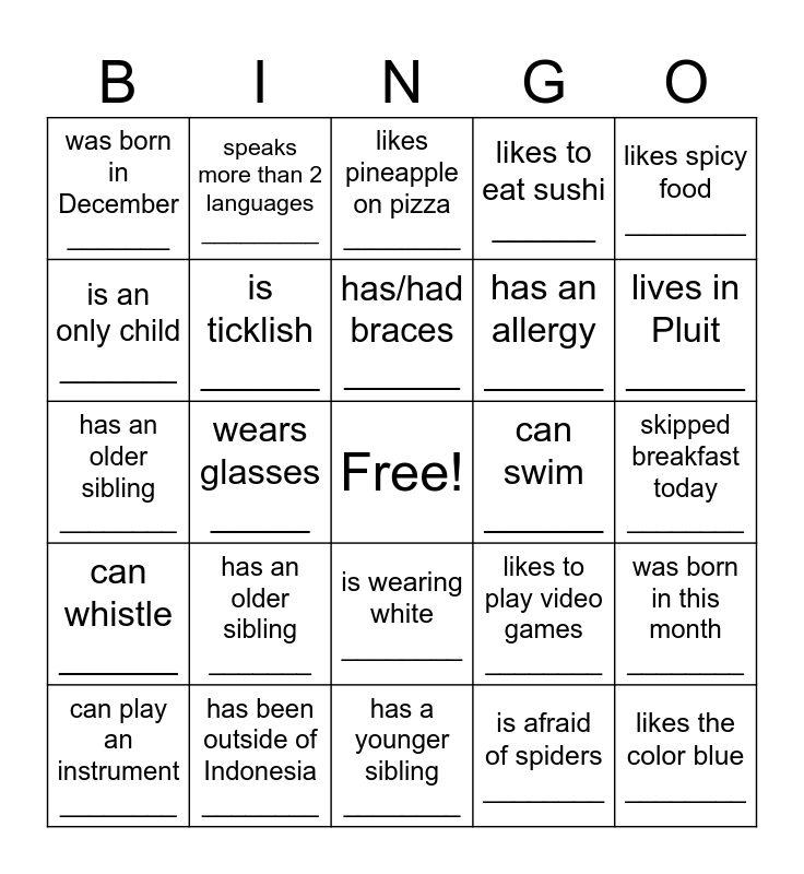 This bingo card has a free space and 24 words: has an older sibling _______, has been outside of Indonesia ________, has/had braces ______, can play an instrument ________, likes spicy food ________, was born in December _______, is an only child _______, speaks more than 2 languages _________, can swim ______, is wearing white ________, has an allergy ______, has an older sibling ________, likes to play video games ________, was born in this month ________, is ticklish ______, is afraid of spiders ________, skipped breakfast today ________, likes pineapple on pizza ________, lives in Pluit ______, wears glasses _____, likes the color blue ________, can whistle ______, likes to eat sushi ______ and has a younger sibling ________.