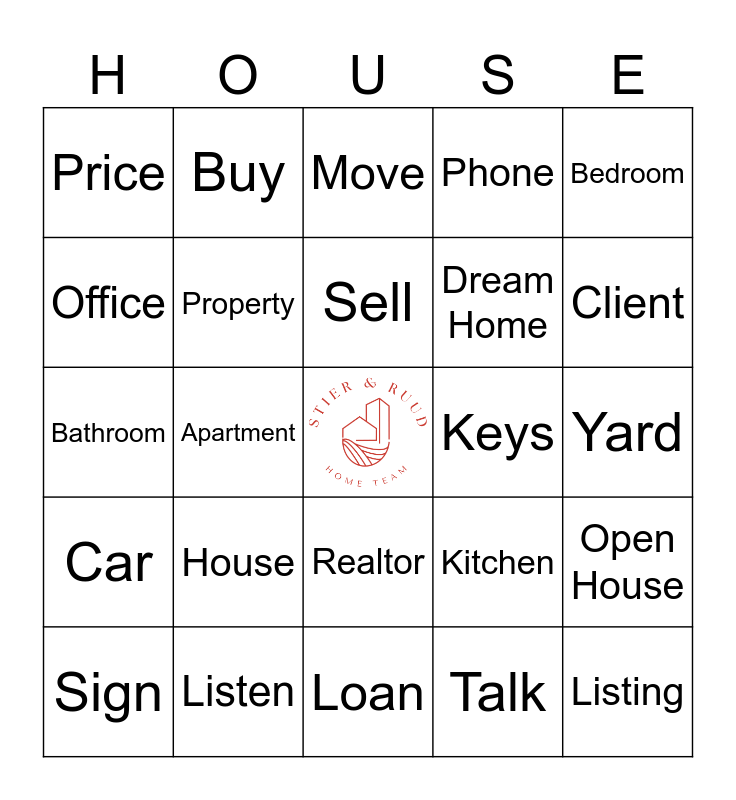 This bingo card has a free space and 25 words: House, Loan, Sell, Sign, Bedroom, Price, Office, Buy, Keys, Realtor, Dream Home, Bathroom, Kitchen, Open House, Property, Townhouse, Yard, Move, Client, Apartment, Listing, Listen, Car, Phone and Talk.