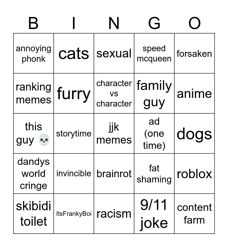 This bingo card has a free space and 24 words: invincible, ItsFrankyBoi, character vs character, skibidi toilet, forsaken, annoying phonk, ranking memes, cats, ad (one time), brainrot, family guy, this guy 💀, fat shaming, roblox, furry, 9/11 joke, dogs, sexual, anime, storytime, content farm, dandys world cringe, speed mcqueen and racism.