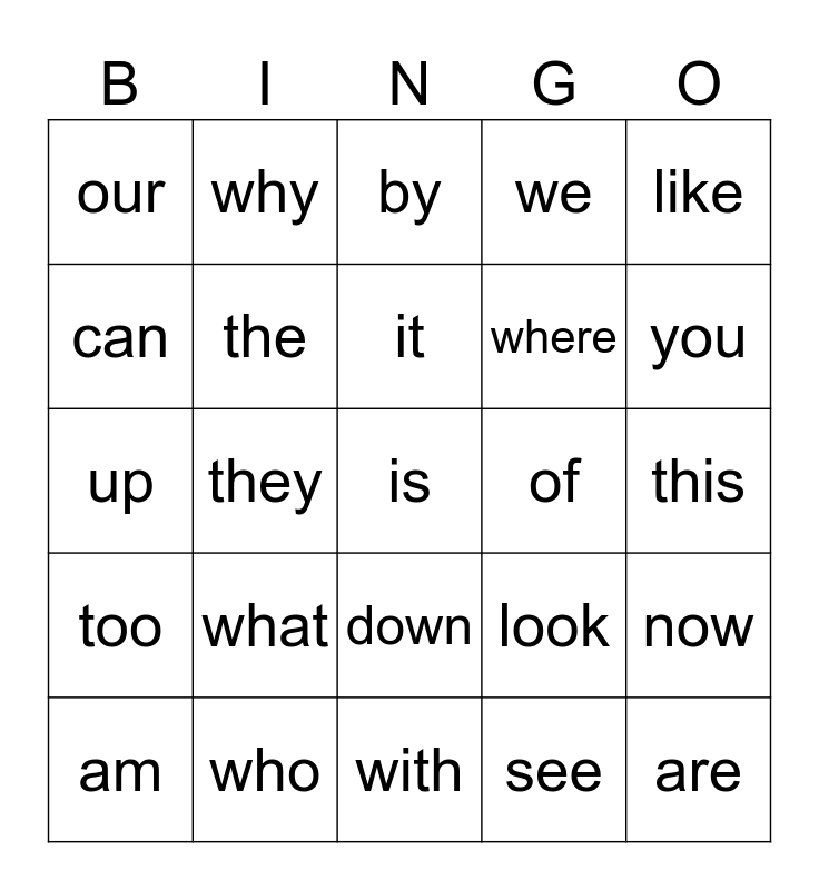 This bingo card has a free space and 24 words: what, who, it, am, like, our, can, why, of, down, where, up, look, now, the, see, this, by, you, they, are, too, we and with.