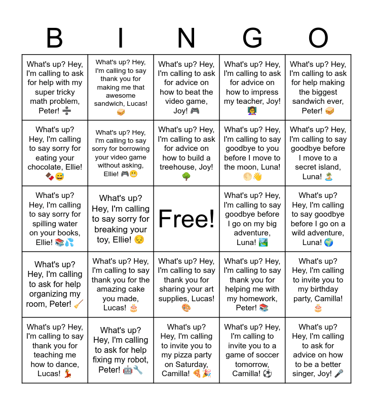 This bingo card has a free space and 27 words: What's up? Hey, I'm calling to say thank you for helping me with my homework, Peter! ๐, What's up? Hey, I'm calling to ask for help fixing my skateboard, Lucas! ๐น, What's up? Hey, I'm calling to say goodbye to you before I move to the moon, Luna! ๐๐, What's up? Hey, I'm calling to invite you to my pizza party on Saturday, Camilla! ๐๐, What's up? Hey, I'm calling to say sorry for eating your chocolate, Ellie! ๐ซ๐ , What's up? Hey, I'm calling to ask for advice on how to beat the video game, Joy! ๐ฎ, What's up? Hey, I'm calling to say thank you for making me that awesome sandwich, Lucas! ๐ฅช, What's up? Hey, I'm calling to ask for help organizing my room, Peter! ๐งน, What's up? Hey, I'm calling to say goodbye before I go on my big adventure, Luna! ๐๏ธ, What's up? Hey, I'm calling to invite you to my birthday party, Camilla! ๐, What's up? Hey, I'm calling to say sorry for spilling water on your books, Ellie! ๐๐ฆ, What's up? Hey, I'm calling to ask for advice on how to impress my teacher, Joy! ๐ฉโ๐ซ, What's up? Hey, I'm calling to say thank you for teaching me how to dance, Lucas! ๐, What's up? Hey, I'm calling to ask for help fixing my robot, Peter! ๐ค๐ง, What's up? Hey, I'm calling to say goodbye before I move to a secret island, Luna! ๐๏ธ, What's up? Hey, I'm calling to invite you to my science experiment, Camilla! ๐งช, What's up? Hey, I'm calling to say sorry for borrowing your video game without asking, Ellie! ๐ฎ๐ฌ, What's up? Hey, I'm calling to ask for advice on how to build a treehouse, Joy! ๐ณ, What's up? Hey, I'm calling to say thank you for the amazing cake you made, Lucas! ๐, What's up? Hey, I'm calling to ask for help with my super tricky math problem, Peter! โ, What's up? Hey, I'm calling to say goodbye before I go on a wild adventure, Luna! ๐, What's up? Hey, I'm calling to invite you to a game of soccer tomorrow, Camilla! โฝ, What's up? Hey, I'm calling to say sorry for breaking your toy, Ellie! ๐, What's up? Hey, I'm calling to ask for advice on how to be a better singer, Joy! ๐ค, What's up? Hey, I'm calling to say thank you for sharing your art supplies, Lucas! ๐จ, What's up? Hey, I'm calling to ask for help making the biggest sandwich ever, Peter! ๐ฅช and What's up? Hey, I'm calling to say goodbye before I go on my treasure hunt, Luna! ๐ดโ.