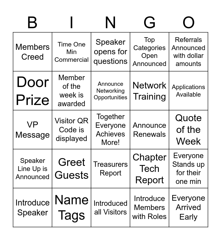 This bingo card has a free space and 24 words: Greet Guests, Name Tags, Announce Networking Opportunities, Introduce Speaker, Referrals Announced with dollar amounts, Members Creed, Door Prize, Time One Min Commercial, Announce Renewals, Treasurers Report, Network Training, VP Message, Chapter Tech Report, Everyone Stands up for their one min, Member of the week is awarded, Introduce Members with Roles, Quote of the Week, Speaker opens for questions, Applications Available, Visitor QR Code is displayed, Everyone Arrived Early, Speaker Line Up is Announced, Top Categories Open Announced and Introduced all Visitors.