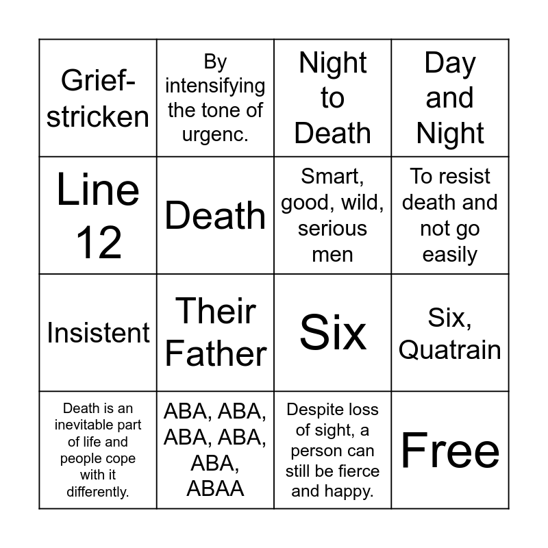This bingo card has 16 words: ABA, ABA, ABA, ABA, ABA, ABAA, Six, Quatrain, Night to Death, Grief-stricken, Insistent, By intensifying the tone of urgenc., Six, Despite loss of sight, a person can still be fierce and happy., Line 12, Death, Death is an inevitable part of life and people cope with it differently., Day and Night, Their Father, To resist death and not go easily, Smart, good, wild, serious men and Free.